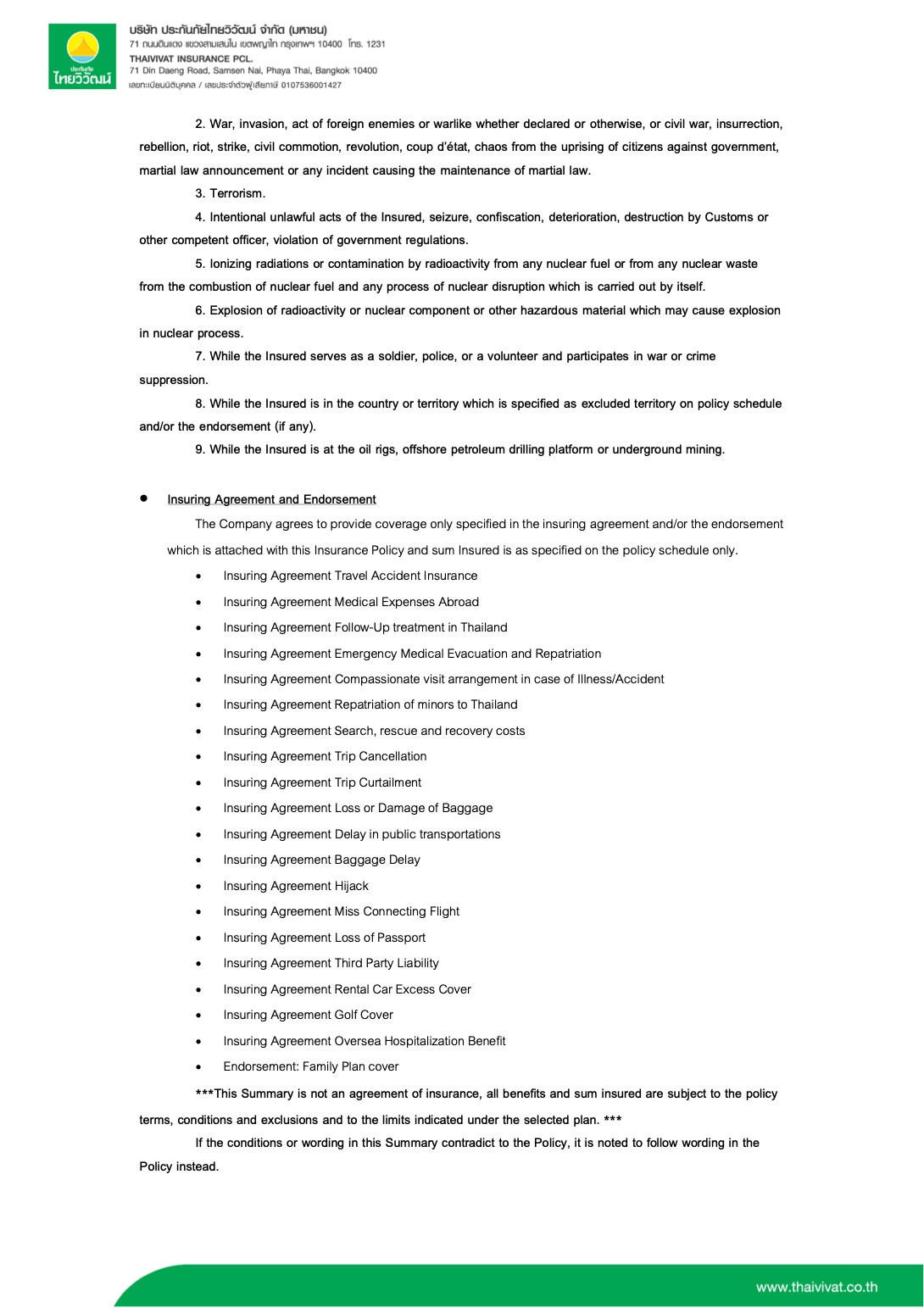| 8. การล่าช้าของการเดินทาง / Cover of delay 8.1 การล่าช้าของระบบขนส่งมวลชน / Delay in public transportations 8.2 การล่าช้าของสัมภาระ / Baggage Delay 8.3 การจี้เครื่องบิน / Hijack 8.4 การพลาดต่อเที่ยวบิน / Missed connection flight |